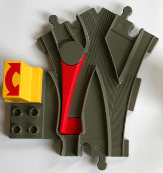 The new switches have only two parts: rails and point. A train passing over a switch from a joining track with the point set to the other joining track will push the point to the other state, thus "erasing" any previous decision. This may be important if we want to make a layout that performs some computation. In addition, since there is no state spring it is easy to leave the new switch in between guiding left and guiding right.