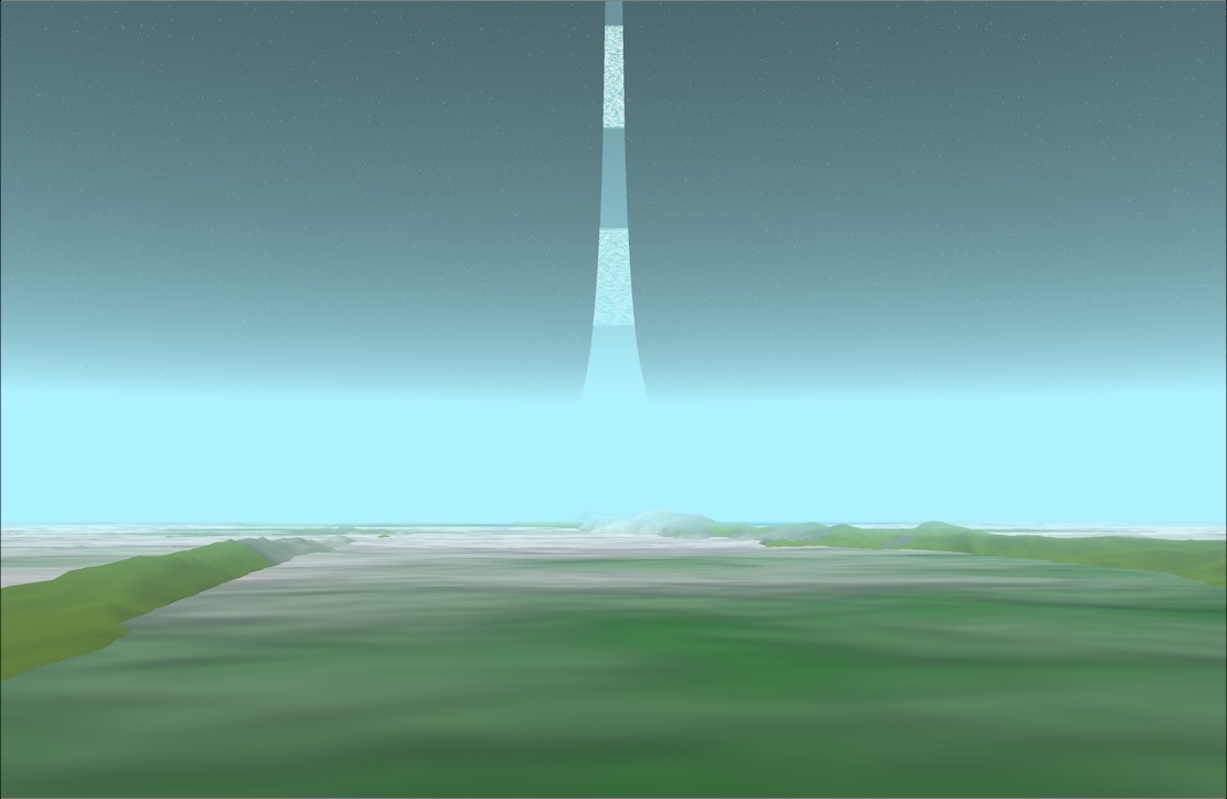 The atmosphere was the most difficult part to model: I found no off-the-shelf volumetric textures that simulate our air, which is a light-scattering gas that thins out with altitude. It is not surprising that such a texture is not available, since skies used in animated movies are normal skies, lit by a distant Sun, whereas the one of the Ringworld curves up and is not limited by a horizon. One person suggested using an image editing program to overlay a blueish layer with alpha-channel gradients. While any post-processing of this kind would work for the production of a sci-fi image, in this particular case I did not want a pretty, imaginative picture, I wanted a correct simulation of the physics.